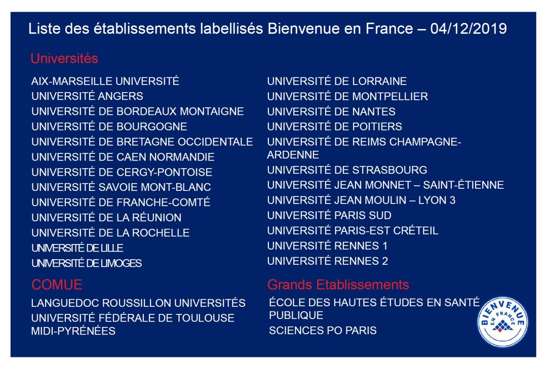 为了改善国际学生的接待质量,法国政府创立了“法国欢迎你”国际学生接待服务认证体系。“法国欢迎你” 认证标志将会颁发给那些保证为国际学生最优接待质量、从本科一年级起便提供英文授课、拥有一站式接待窗口、提供住房以及就业辅助措施的学校。57所法国高校获得“法国欢迎你”认证。